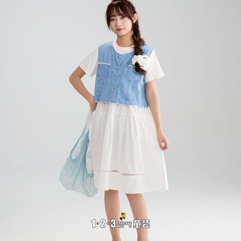 (多多同款)牛仔蓝 夏款 女大童6F20834 DDDD时尚短袖连衣裙1+2=3童装连锁