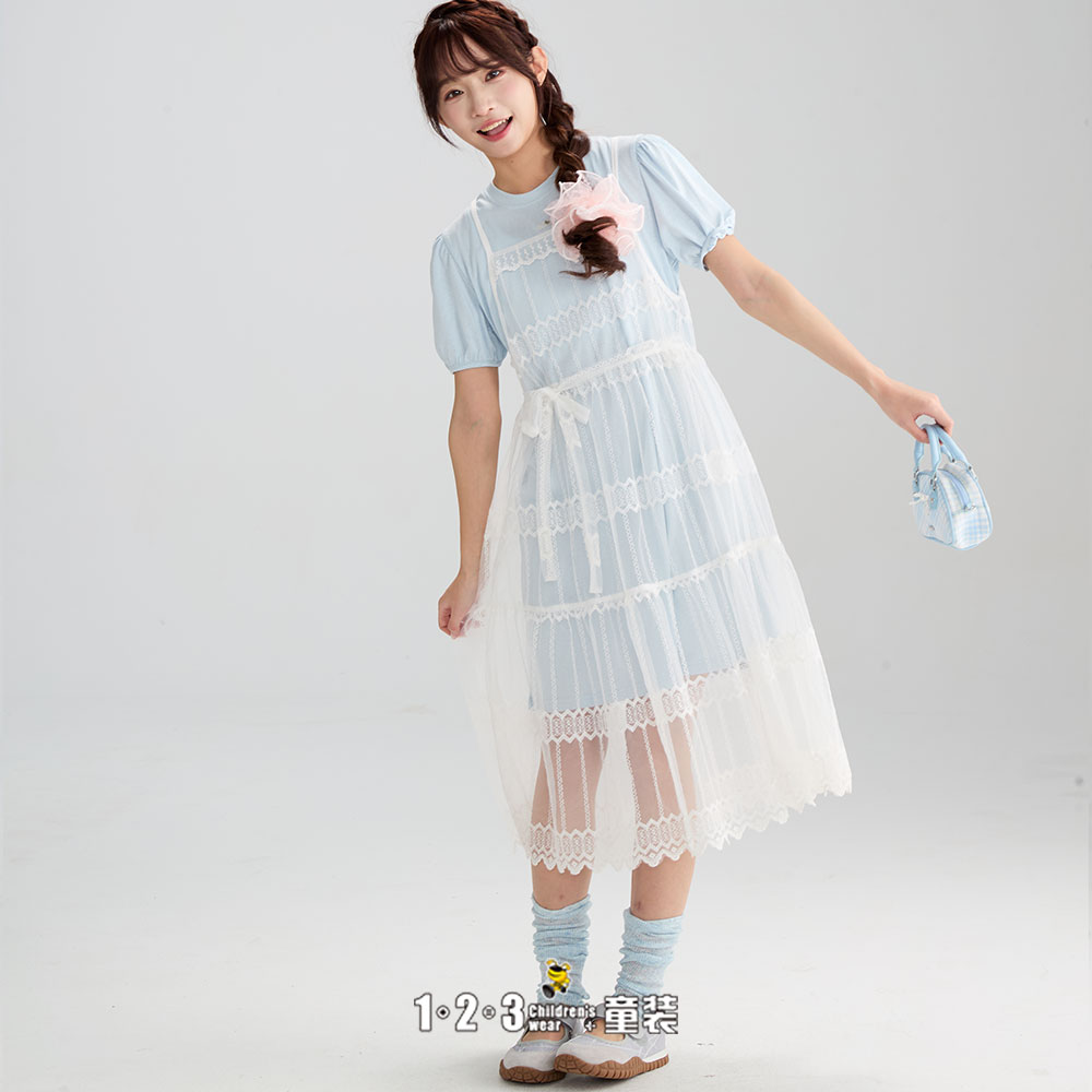 浅蓝 夏款 女大童6F20351 PCDD时尚短袖连衣裙1+2=3童装连锁