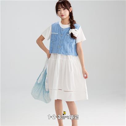 >>(多多同款)牛仔蓝 夏款 女大童6F20834 DDDD时尚短袖连衣裙1+2=3童装连锁